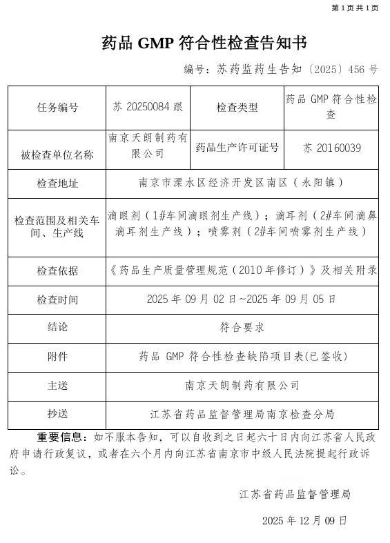 2025 年0 9 月,天朗制藥接受了為期四天的依職責(zé)藥品 GMP 符合性檢查,檢查范圍涉及滴眼劑(1# 車間滴眼劑生產(chǎn)線)、滴耳劑(2# 車間滴鼻滴耳劑生產(chǎn)線)、噴霧劑(2# 車間噴霧劑生產(chǎn)線);近日,企業(yè)取得藥品GMP符合性檢查告知書,檢查結(jié)論:符合要求。